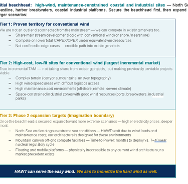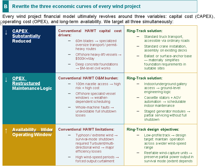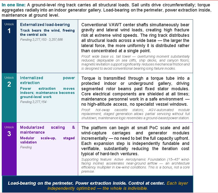 The Ring-Track platform is designed to push that boundary outward. Through a low-profile ring architecture, modular deployment, ground-accessible power extraction, and a system-level patent portfolio covering startup, drive, and aerodynamic performance, we make a much wider range of wind-resource scenarios economically evaluable.